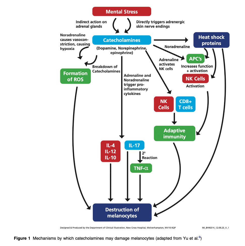 ally act on a and b adrenoreceptors to release melanocyte destructive IL-4, IL-10, IL-12, and IL-17 (the latter of which can initiate TNF-a—a key factor in pigment cell damage) and activate innate and adaptive immunity, for example, via CD8 NK and antigen-presenting (APC) cells (Figure 1). Further-more, catecholamines stimulate heat shock proteins (HSP)— which themselves augment APC activity and amplify immune responses through reactive oxygen species (ROS) and cyto-